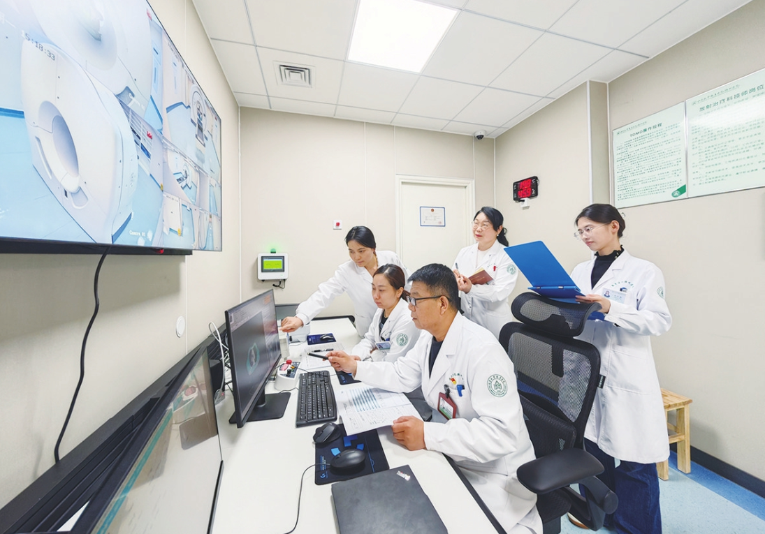 孟令軍(中)利用螺旋斷層放射治療系統(tǒng)為患者進行治療。記者唐志梅攝