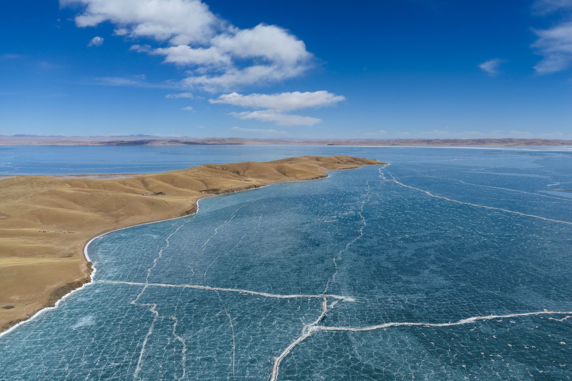 初春時(shí)節(jié),黃河源地區(qū)冰雪漸融,湖冰與廣袤草原相映成景,盡顯遼闊壯美。
