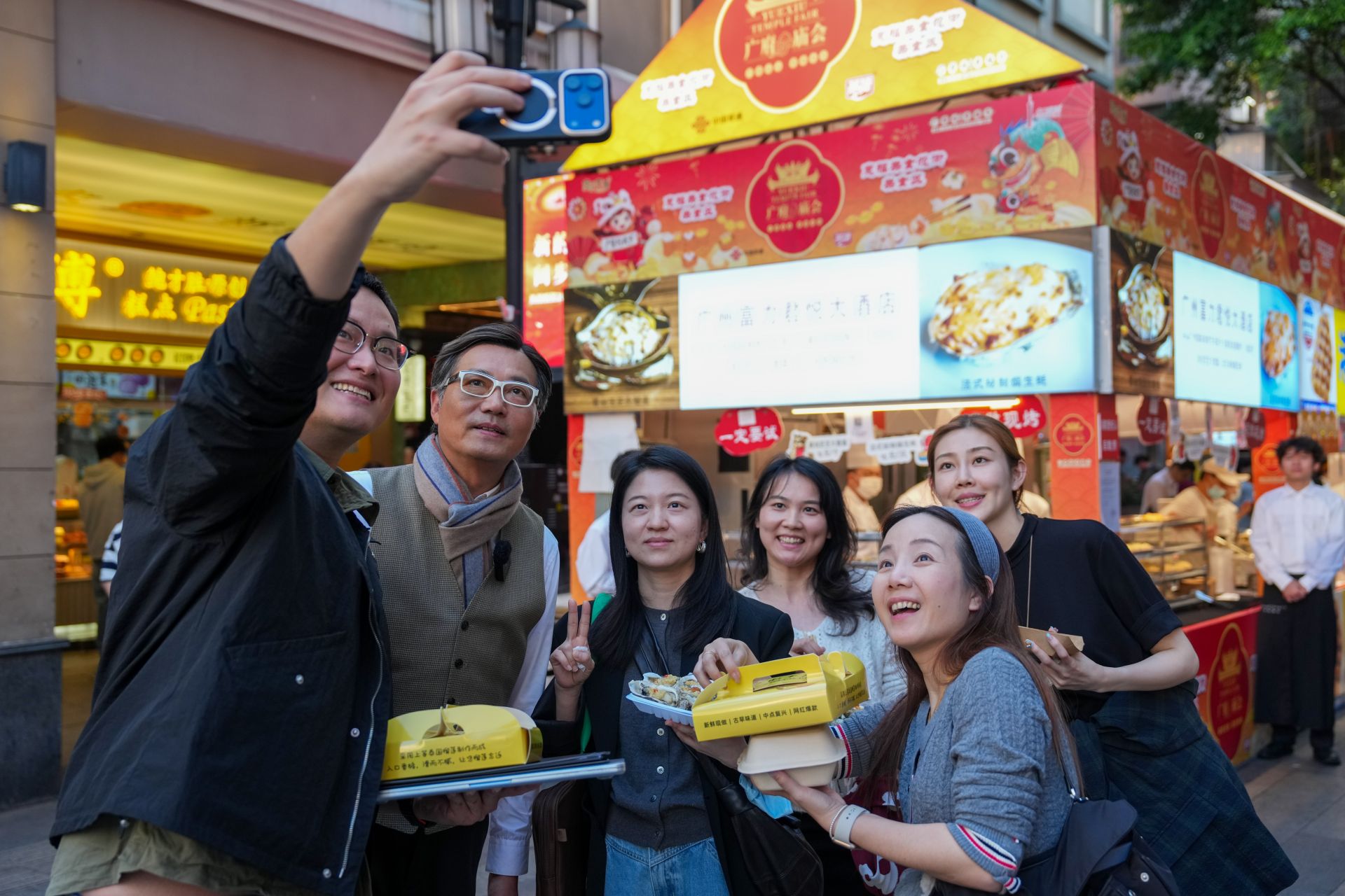 3月12日,在廣州市越秀區(qū)北京路步行街區(qū)舉辦的美食廟會(huì)上,市民、游客與廣州旅游美食形象大使莊臣(左二)合影。
