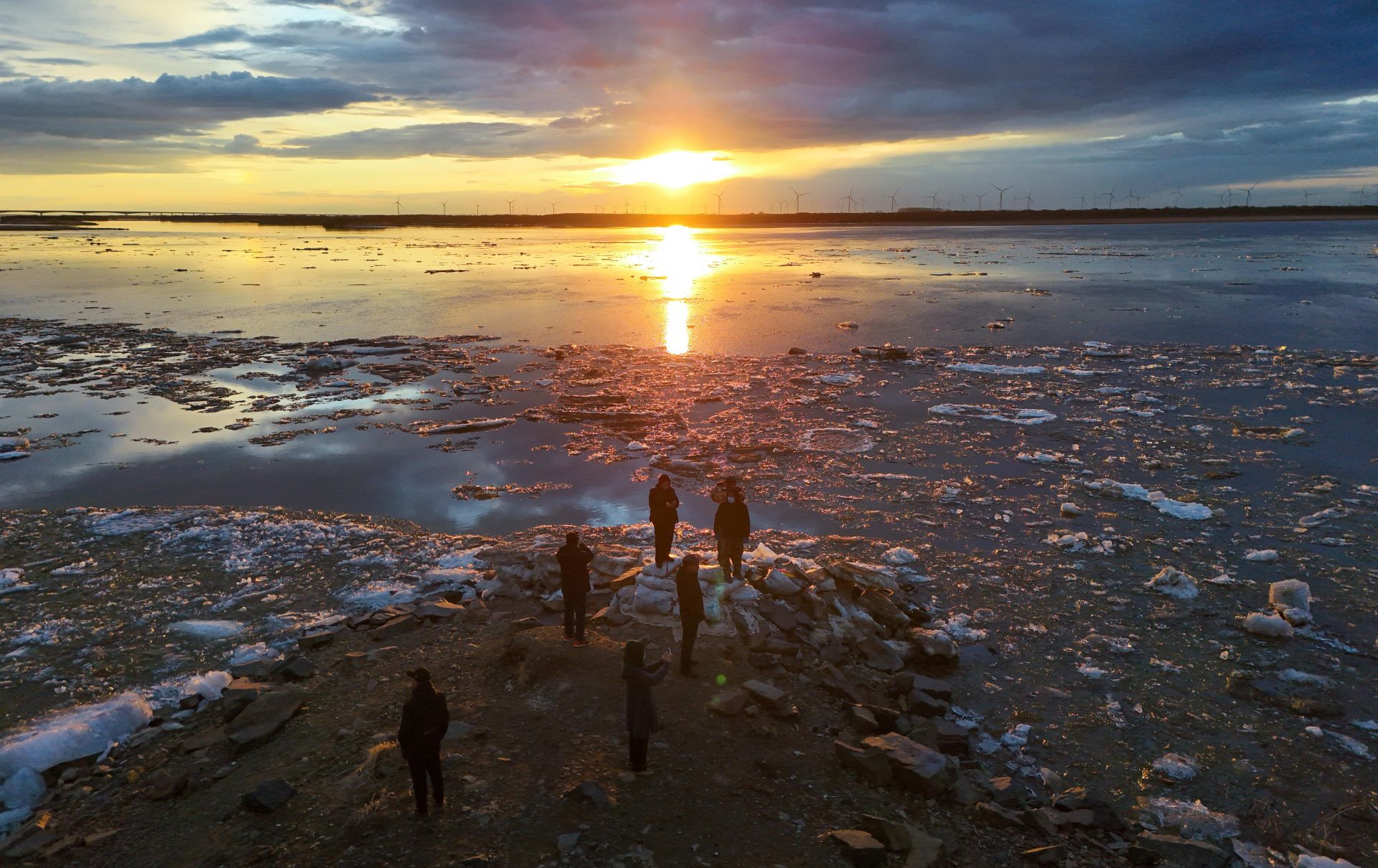 4月13日,人們在觀賞松花江干流富錦段流冰景觀(無人機照片)。