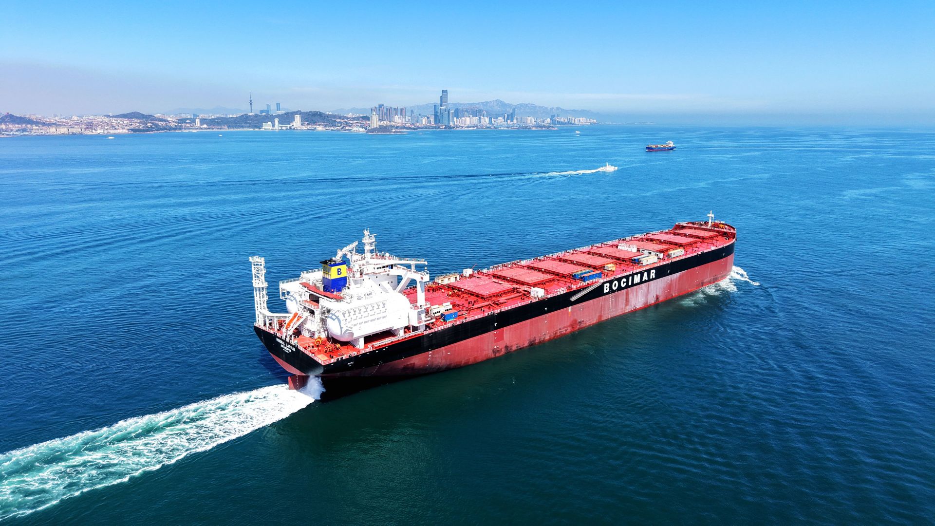 4月13日,21萬噸綠色燃料船舶在青島膠州灣海試(無人機照片)。