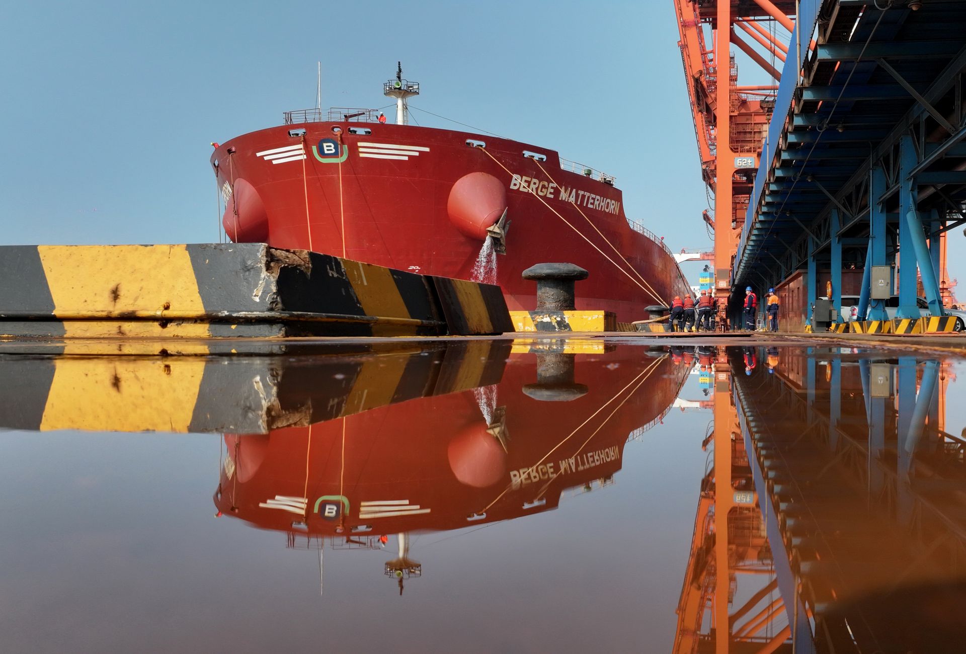 4月15日,工人在唐山港曹妃甸港區(qū)礦石碼頭為準(zhǔn)備離港的輪船解纜繩(無人機(jī)照片)。