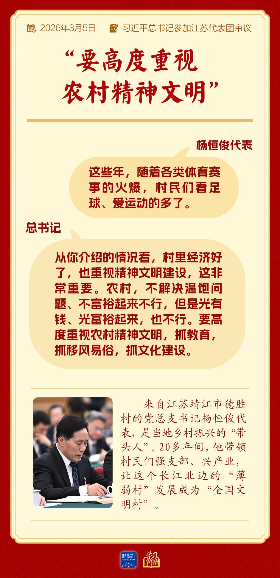 總書記強調:“從你介紹的情況看,村里經濟好了,也重視精神文明建設,這非常重要。農村,不解決溫飽問題、不富裕起來不行,但是光有錢、光富裕起來,也不行。要高度重視農村精神文明,抓教育,抓移風易俗,抓文化建設。”